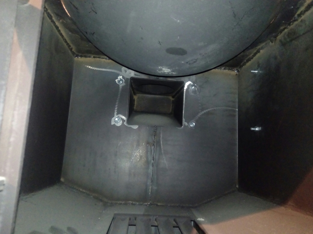 Топочная дверца очага для казана оснащена внутренней рамкой и запорным механизмом, которые обеспечивают плотное прилегание дверцы к корпусу казан-мангала и способствуют защите ее от деформации в процессе эксплуатации.