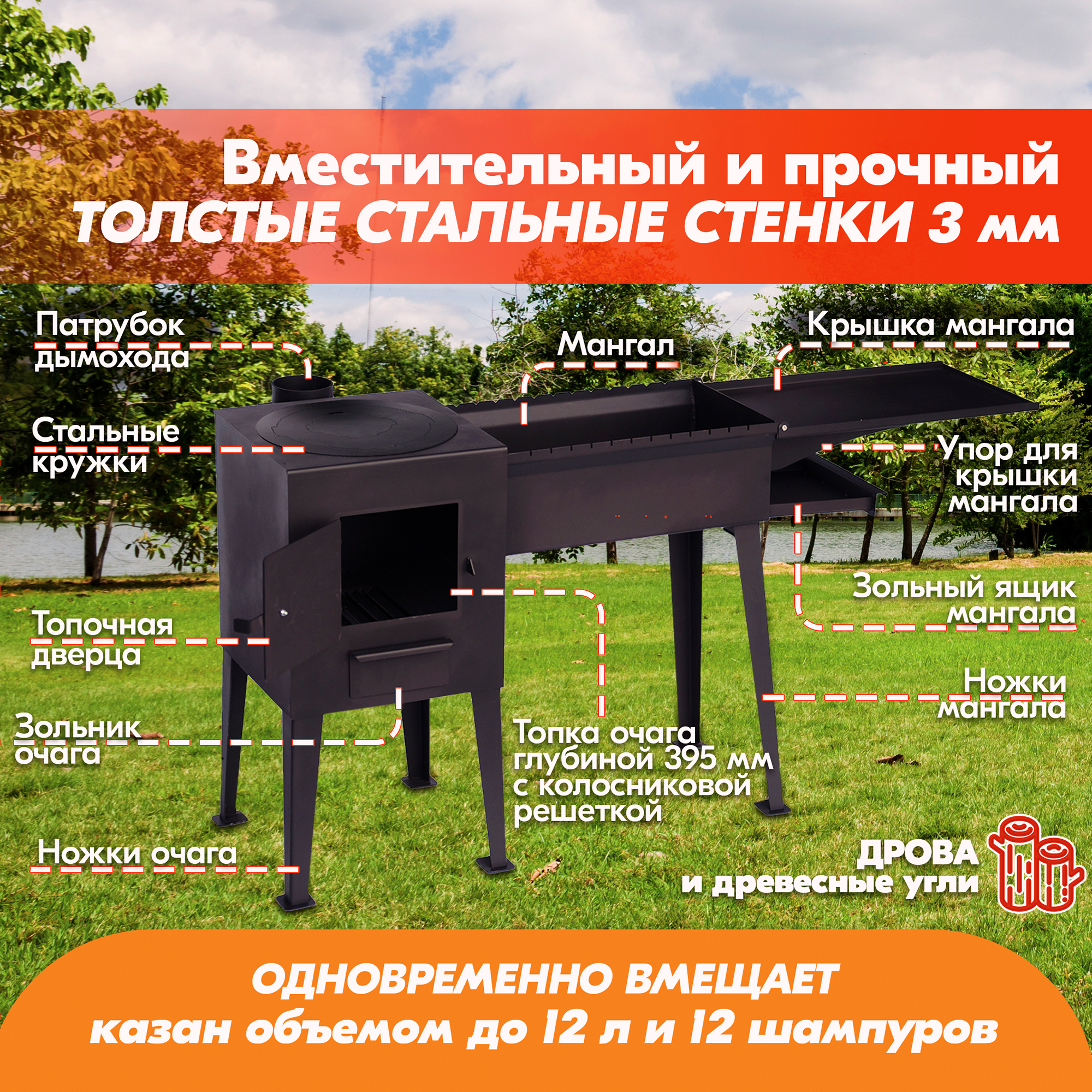 Стальная печь под казан может использоваться с казанами, объемом от 8 до 12 литров, а также с любой чугунной или металлической посудой.